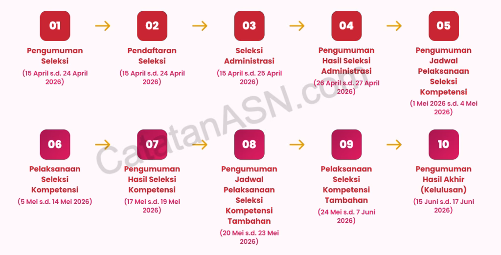 - 5 Mei – 14 Mei 2026: Pelaksanaan Seleksi Kompetensi. (Ujian menggunakan sistem CAT BKN yang transparan. Langsung ketahuan nilainya!).
